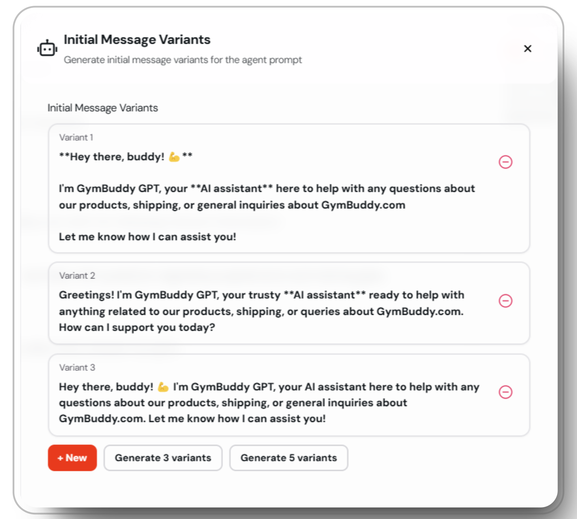 The initial message in Eagle Agents allows you to set predefined starter messages that your AI agent sends every time a new user interacts with the widget. These messages help set the tone and provide initial guidance to users.You can add multiple variants of the initial message, and a random variant will be shown to the user each time for a unique experience. You also have the option to generate new variants using AI, which can save time and effort.